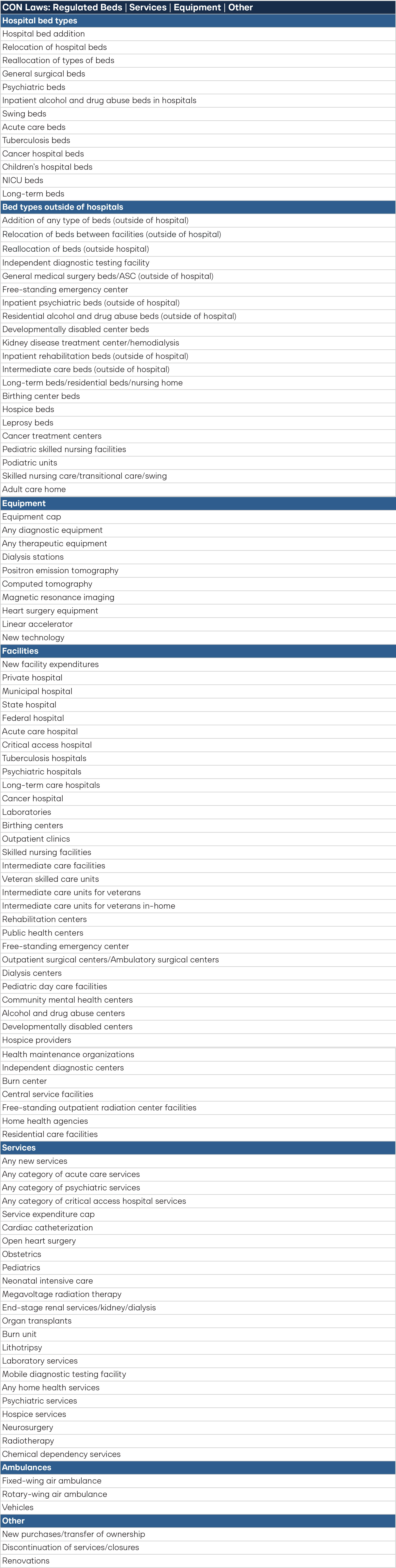 Note: While the dataset is intended to encompass everything possible, CON laws are notoriously broad. The list above still does not cover every possible type of service, facility, equipment, bed, or other item regulated by CON, especially when clauses such as “any new service” exist in the state code.