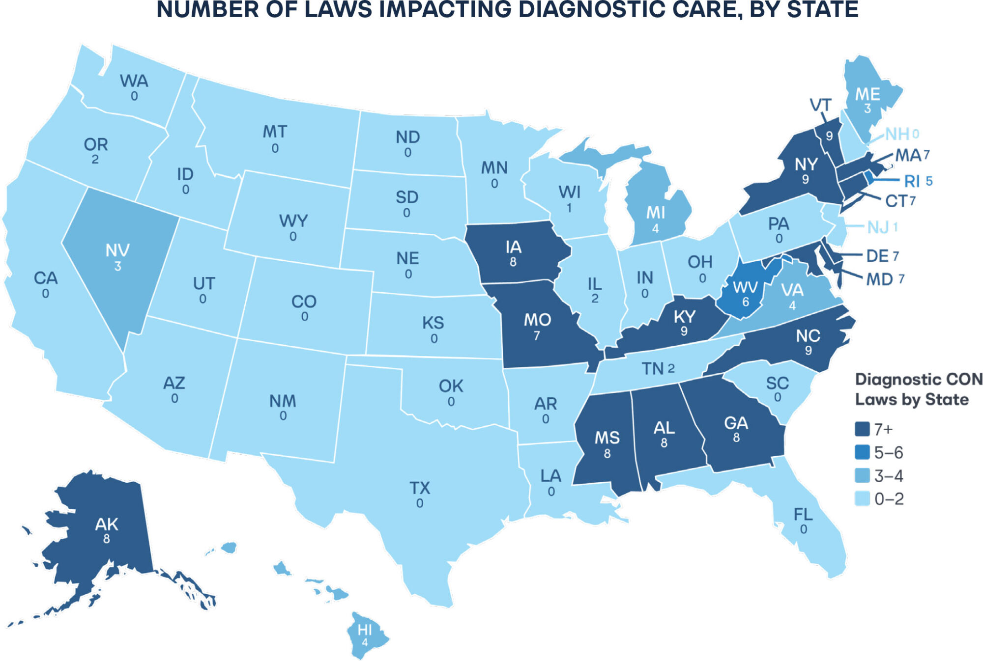 Diagnostic services are subject to nine CONs, covering technologies such as MRI, CT, and PET scanners, as well as dedicated facilities like independent diagnostic centers. These requirements limit patient access to essential imaging and diagnostic testing, suppress market entry for mobile diagnostic units, and contribute to higher costs and longer wait times for patients seeking early detection. Eliminating these CONs would accelerate the adoption of advanced diagnostic tools, promote early intervention in diseases such as cancer and stroke (when timing is critical), and empower community-level clinics to offer modern diagnostic capacity without costly regulatory delays. Research shows that MRI facilities are 14 percent less likely to operate in CON-regulated states52, and repealing these laws is associated with 2,499 fewer lung cancer deaths each year.53 Evidence that delayed diagnostics under CON regimes come at a measurable human cost.