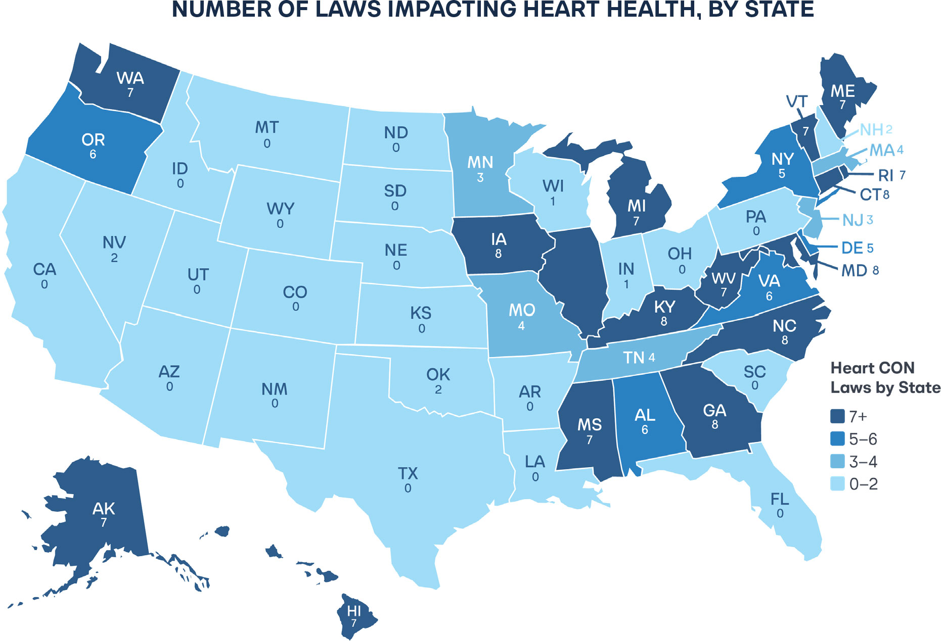 In the field of cardiovascular care and heart health, eight CONs govern related healthcare; this includes the establishment of catheterization services, cardiac surgery equipment, providing open heart surgery, and organ transplants (in addition to related diagnostic equipment such as CT or MRI machines used in cardiac imaging). Residents in states with multiple cardiac-care CONs likely face longer average travel distances to treatment centers and delayed access to time-sensitive interventions. Removing these CONs would foster competition, increase access to timely cardiac procedures, and reduce mortality from acute cardiac events. Empirical evidence shows that states maintaining heart-health CON laws experience six to 10 percent higher heart-attack death rates within three years of enactment54, a pattern the study isolated by border-county research. Additionally, disparities in heart health care outcomes between black and white demographics dissipate when CON review is repealed for heart-related services.55 Repeal would expand cardiac care capacity, shorten emergency response times, and save lives each year.