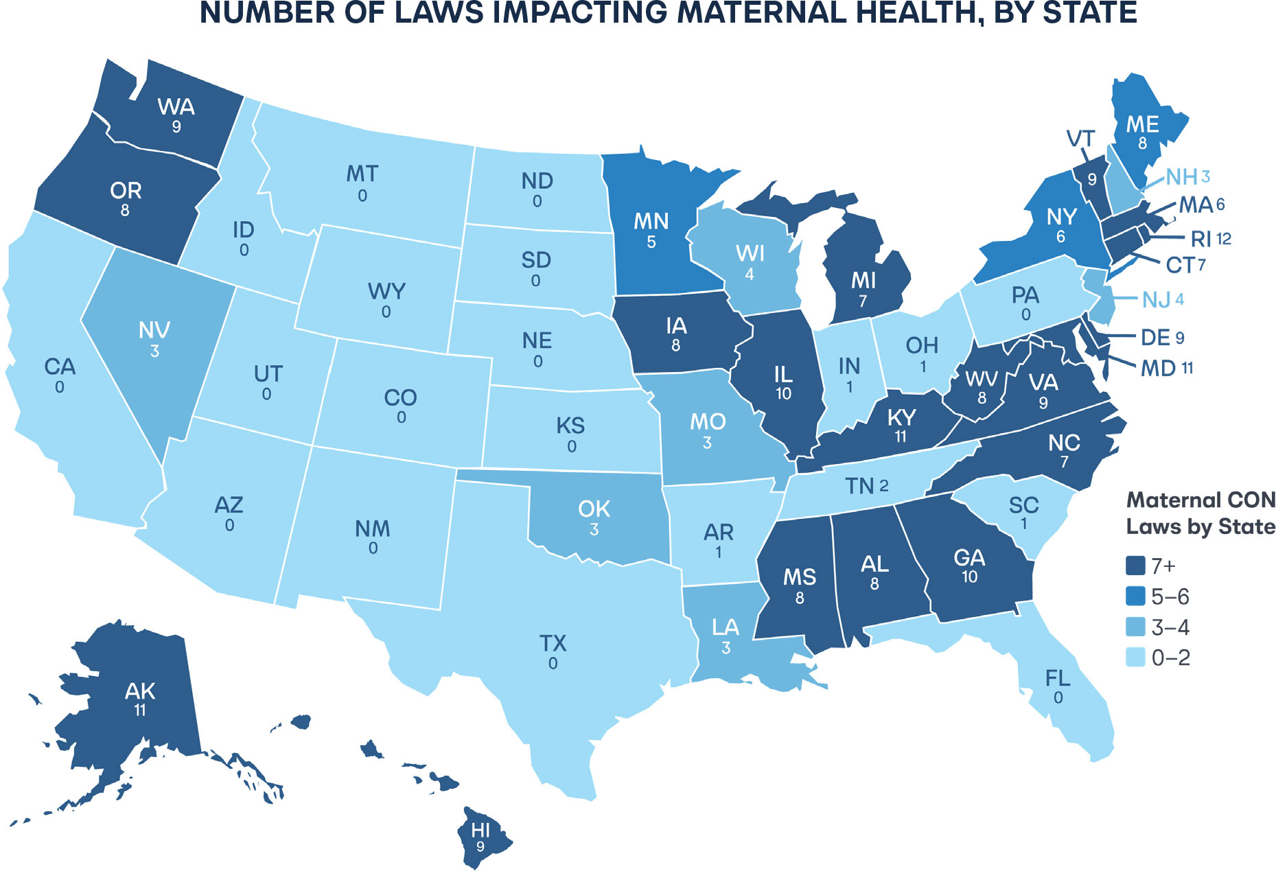 Across the United States, our analysis identified 12 separate CONs directly affecting maternal and infant health services, including obstetric beds, neonatal intensive care units, birthing centers, and related facilities. States imposing these requirements restrict the ability of hospitals and independent providers to expand maternal care capacity, particularly in rural or low-income regions. These CONs are harmful in any state, but especially in those where maternal mortality rates are already among the nation’s highest. Eliminating CONs related to maternal health would permit more flexible expansion of maternity wards, encourage the creation of community-based birthing centers, and alleviate severe provider shortages that disproportionately harm women of color and rural mothers. With nearly 35 percent of U.S. counties classified as maternal health deserts50 and mothers in CON states experiencing eight percent higher rates of inadequate prenatal care51, the evidence is clear: CON laws deepen the maternal care crisis by cutting off access where it is needed most.