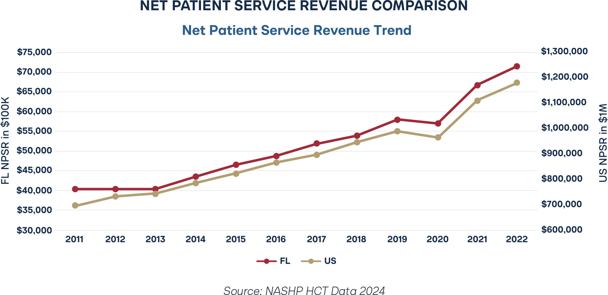 Florida repealed CON for Class I hospitals in 2019 and Class II hospitals in 2021. Net patient service revenue represents a hospital’s profit after accounting for Medicaid discounts, charity care, and bad debt. It is clear that, even after the repeal and despite the pandemic-induced dip in 2020, Florida hospital revenue is trending upward, on par with and surpassing overall U.S. trends.
