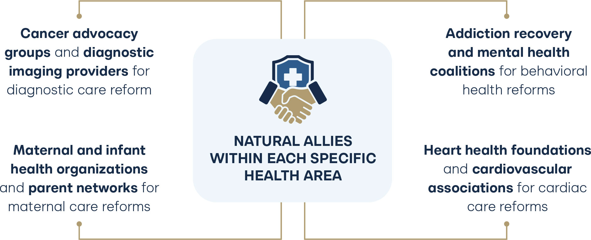 Building strong coalitions with existing thought leaders, patient advocates, and grassroots organizations around these four areas of reform will accelerate progress toward CON repeal. Broadly, this includes patients’ rights advocates and past CON applicants who were denied approval. Within each specific health area, natural allies include cancer advocacy groups and diagnostic imaging providers for diagnostic care reform; maternal and infant health organizations and parent networks for maternal care reforms; addiction recovery and mental health coalitions for behavioral health reforms; and heart health foundations and cardiovascular associations for cardiac care reforms.