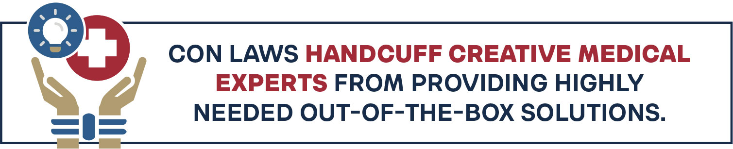 One author writes, “Not only are motivated new practitioners not able to bring their ideas to patients, but current practitioners have little motivation to create anything new themselves. Competition provides one of the main driving forces behind innovation.”45 CON laws handcuff creative medical experts from providing highly needed out-of-the-box solutions. Although challenging to measure, the same author describes a scenario of a man who sought to provide a new service in Virginia that assists with early diagnosis of one of the leading causes of cancer deaths; unfortunately, he never had the chance to give Virginians the same access to this service as residents of other states, because the Commonwealth of Virginia denied him a CON.46 This anecdote, along with others, illustrates that unfettered innovation in the medical field would undoubtedly support improved health outcomes for individuals and families.