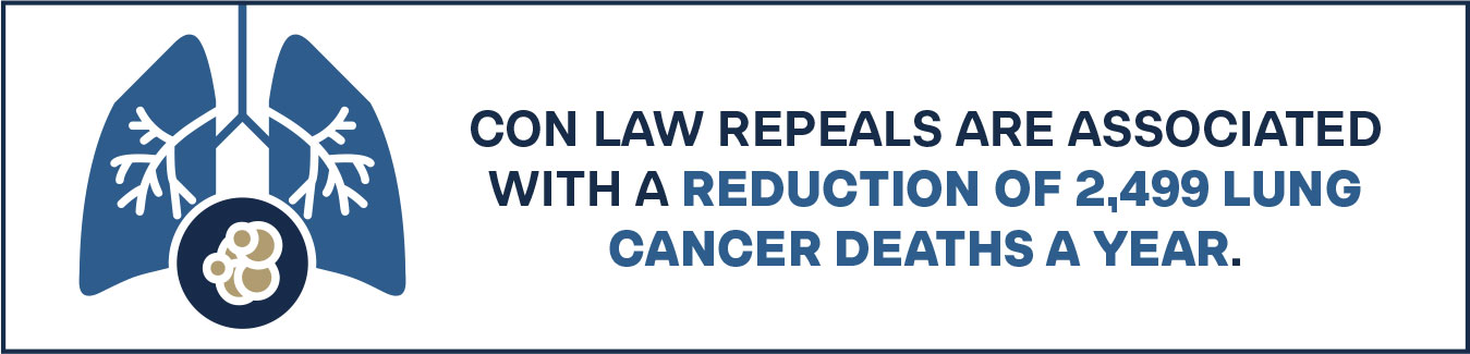 CON law repeals are associated with a reduction of 2,499 lung cancer deaths a year.39 Given the importance of early diagnostic care for cancer patients, delays in diagnostic care can have fatal consequences.