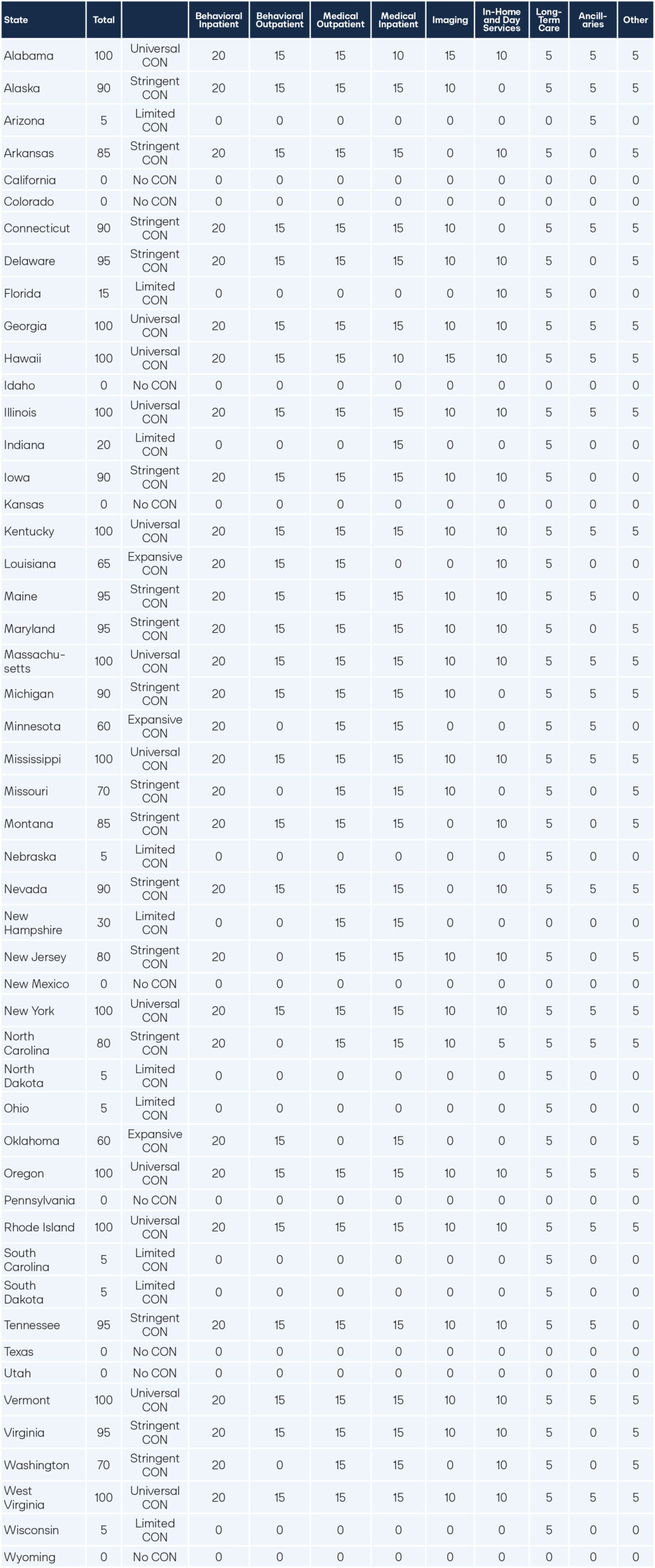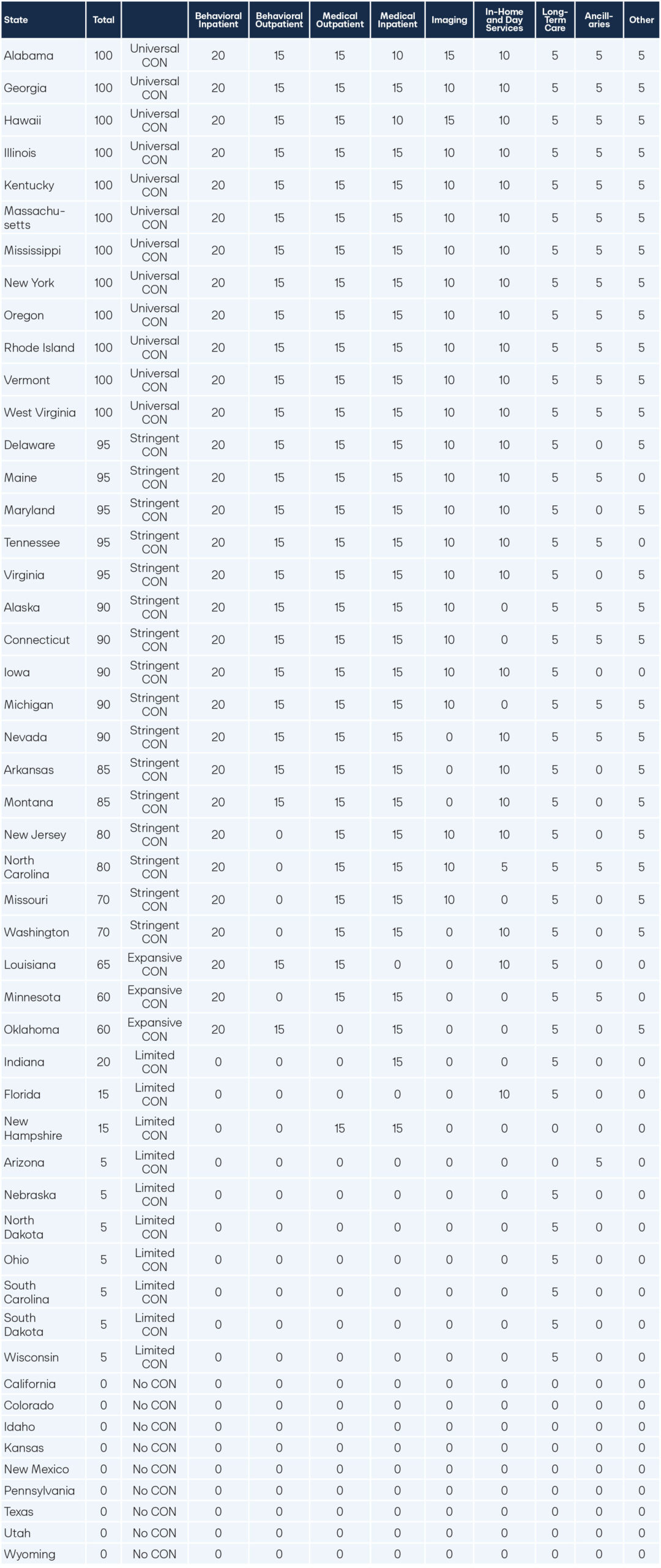 This research provides a legislative taxonomy that scores every state on Certificate of Need (CON) in several categories: Behavioral Outpatient, Behavioral Inpatient, Medical Outpatient, Medical Inpatient, Imaging, In-Home and Day Services, Long-Term Care, Ancillaries, and Other.