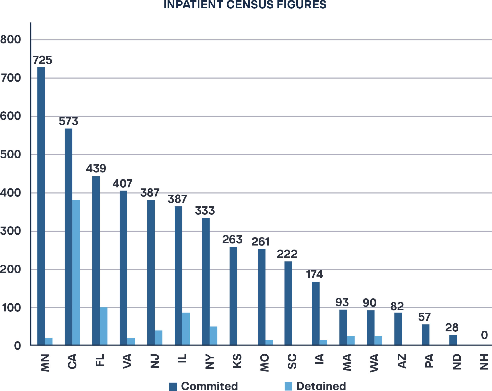 Research on sex offender civil commitment policies is relatively limited, and most states do not regularly publicize information about their civilly committed population. The Sex Offender Civil Commitment Program Network provides the most detailed information on these policies, and they conduct an annual census of the committed sex offender population in each state.13 According to their reports, the states with the highest number of committed sex offenders are Minnesota (736), California (573), Florida (439), Virginia (407), and New Jersey (387).14 The median number of committed offenders across states is 260 people. Across the 19 states that responded, the total committed population was 5,421.15 The vast majority of committed sex offenders, 78 percent, had victims who were children or had victimized both adults and children.16