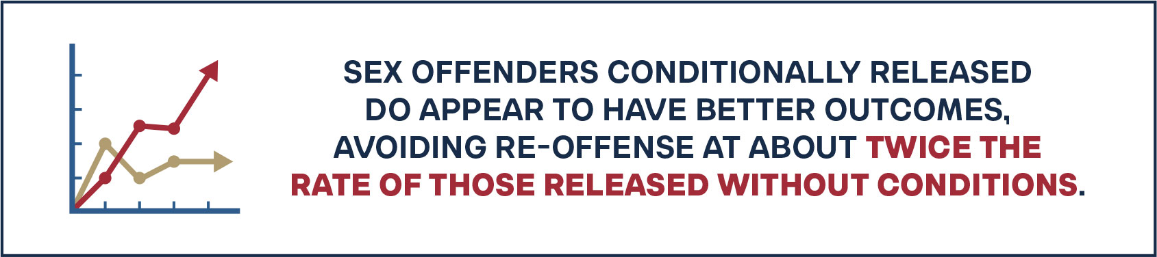 Transitional housing remains a significant challenge for this population, with it taking nine months on average to find an appropriate place to live after an individual is released.29 But those who do make it back into the community on conditional release after their intensive treatment fare quite well. Sex offenders conditionally released do appear to have better outcomes, avoiding re-offense at about twice the rate of those released without conditions.30