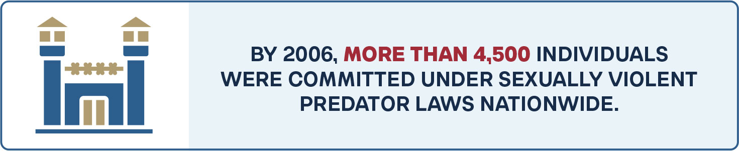 Importantly, civil commitment of sexually violent predators need not happen in lieu of prison. Rather, prosecutors can petition for commitment upon release from prison or even after the individual is back in the community. These laws have been the subject of significant litigation, but ultimately, the U.S. Supreme Court ruled in Kansas v. Hendricks (1997) that they did not violate the Fourteenth Amendment’s protections of due process or against double jeopardy.10 By 2006, more than 4,500 individuals were committed under sexually violent predator laws nationwide.11