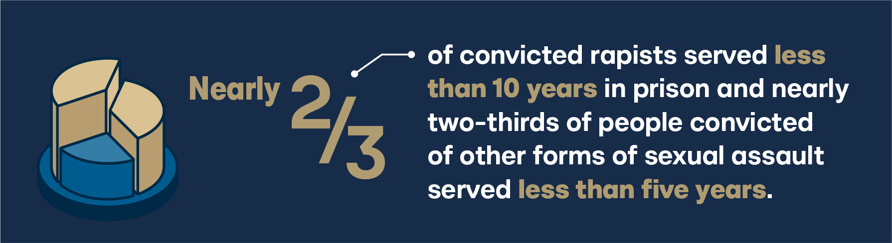 Yet, sex offenders do not typically serve very long prison sentences. The median time served in prison for people convicted of rape was just over 86 months, while the time served for people convicted of other forms of sexual assault was a mere 43 months.34 Most people convicted of sexual offenses at the state level were released far before the end of their full sentence. The Bureau of Justice Statistics found that the average percentage of a prison sentence served by a sex criminal was between 58 and 67 percent.35 Nearly two-thirds of convicted rapists served less than 10 years in prison, and nearly two-thirds of people convicted of other forms of sexual assault served less than five years.36