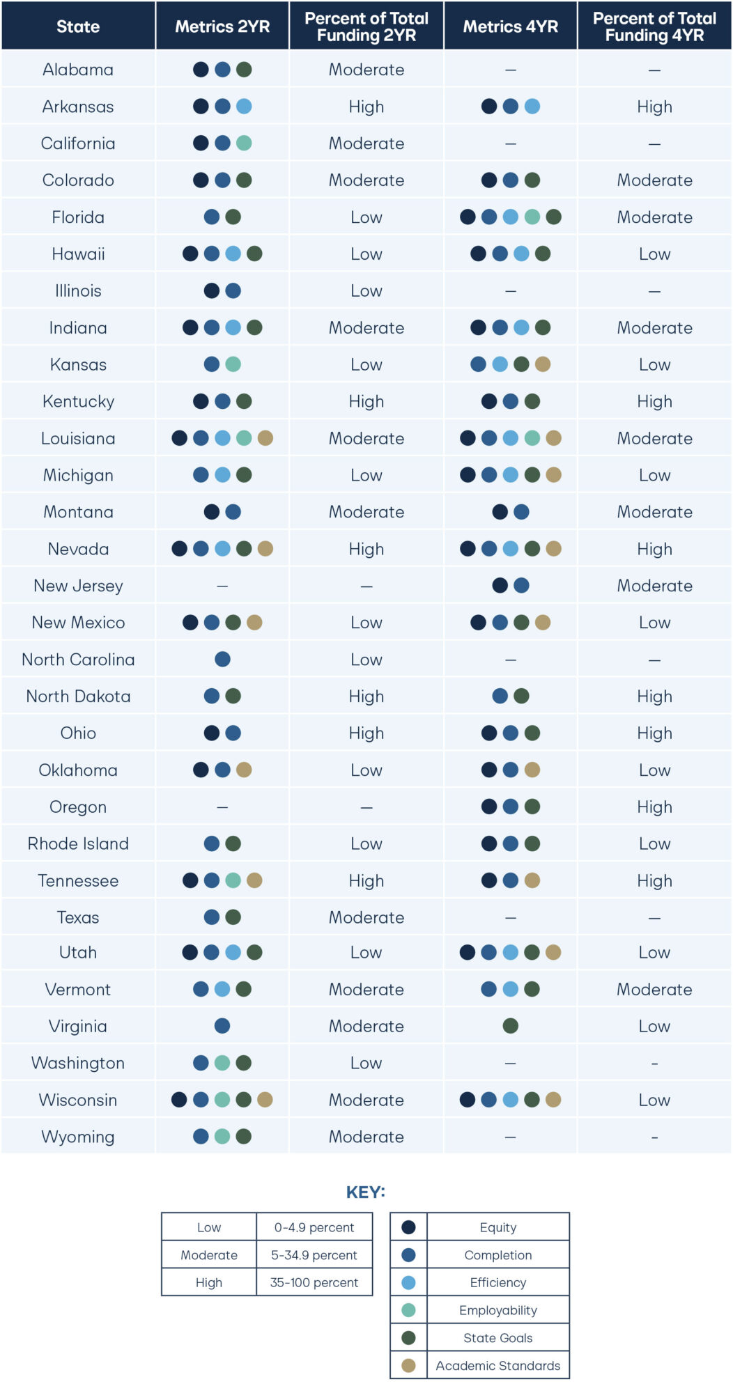 In addition to this, states that only allocate a small percentage of funding to performance measures can only hope to have a small impact on outcomes. It may not be financially viable for an institution to invest in expensive high-touch student success programs if they expect only a small return. The National Center for Higher Education Management Systems suggests that at least 25 percent of total funding be allocated to performance-based funding in order to see significant results.27 Since relative funding stability is possible through performance based funding alone, however, we recommend that 100 percent of state public higher education funding be allocated through performance metrics, so as to achieve maximum impact on school practices and performance.28