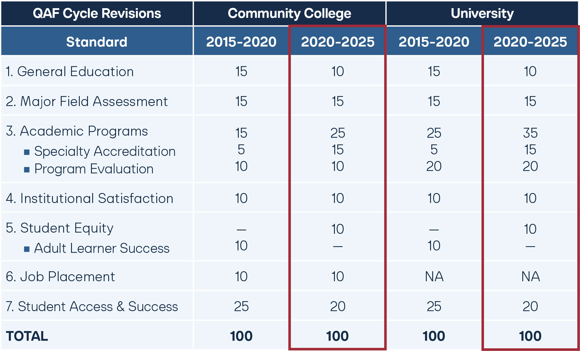Institutions are assessed on seven standards and assigned performance points on these standards out of a possible 100, as shown below. Many of these overlap with the measured outcomes in step one. They are reassessed every five years.