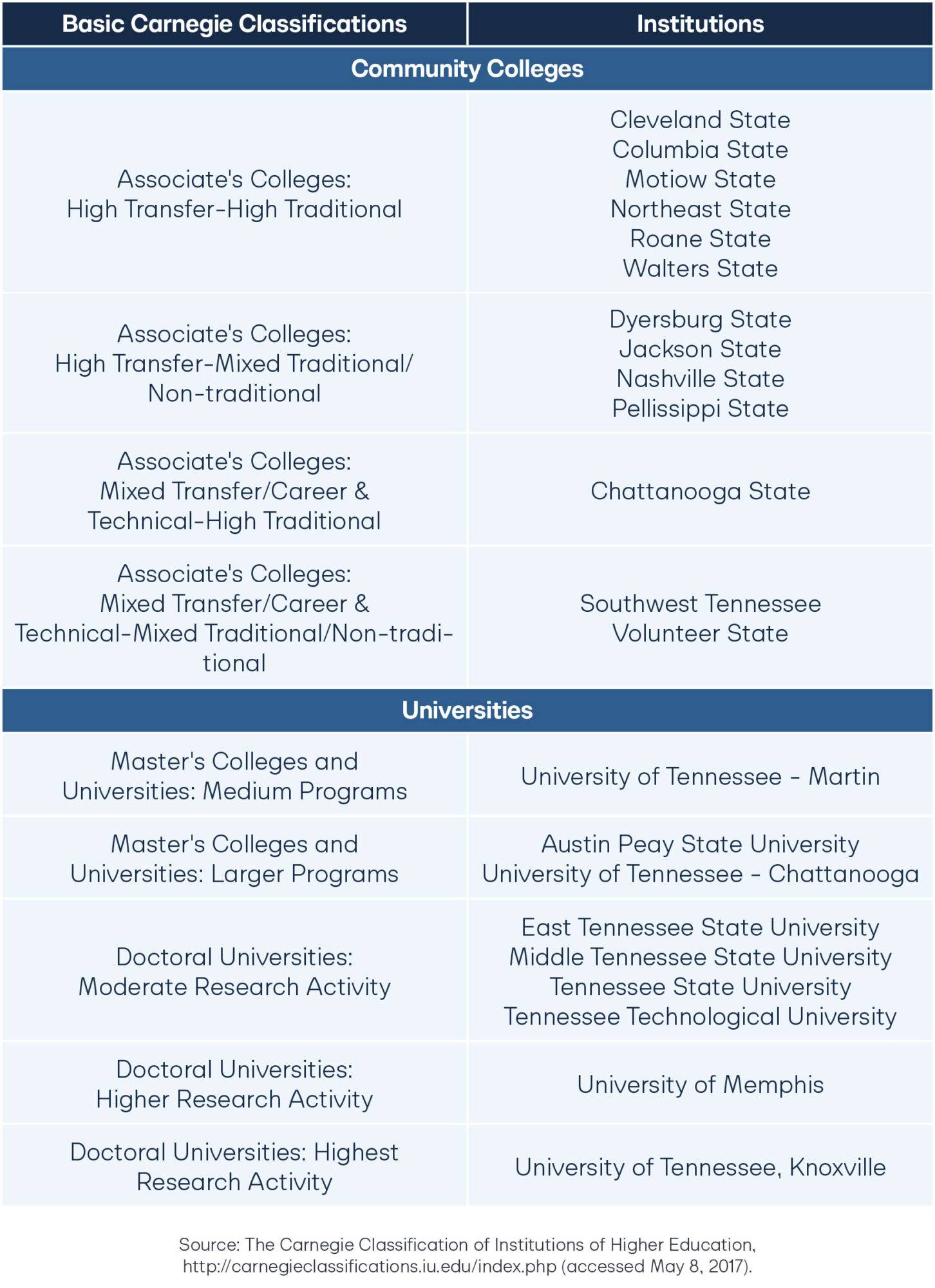 Tennessee’s Community Colleges and Universities by Basic Carnegie Classification