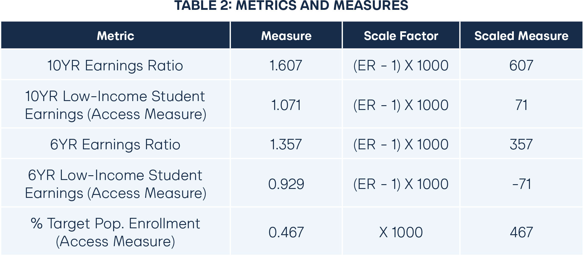 Since disadvantaged backgrounds are often less prepared for postsecondary educational opportunities and tend to have lower earnings after graduation than students of other backgrounds, a focus on long-term earnings has the potential to discourage institutions from recruiting and admitting these students—students for whom education could play the largest transformative role. Including the enrollment of the target population in the funding formula ensures that schools have the incentive to open pathways for students from disadvantaged backgrounds. However, enrollment alone is not sufficient to ensure that higher education will work for these students. In order to ensure that institutions both enroll students with disadvantaged backgrounds and help them succeed, we include the 10-year and 6-year mean earnings for the target population (low-income students in our model). That way, an institution cannot succeed by admitting large numbers of disadvantaged students without also increasing their long-term success.