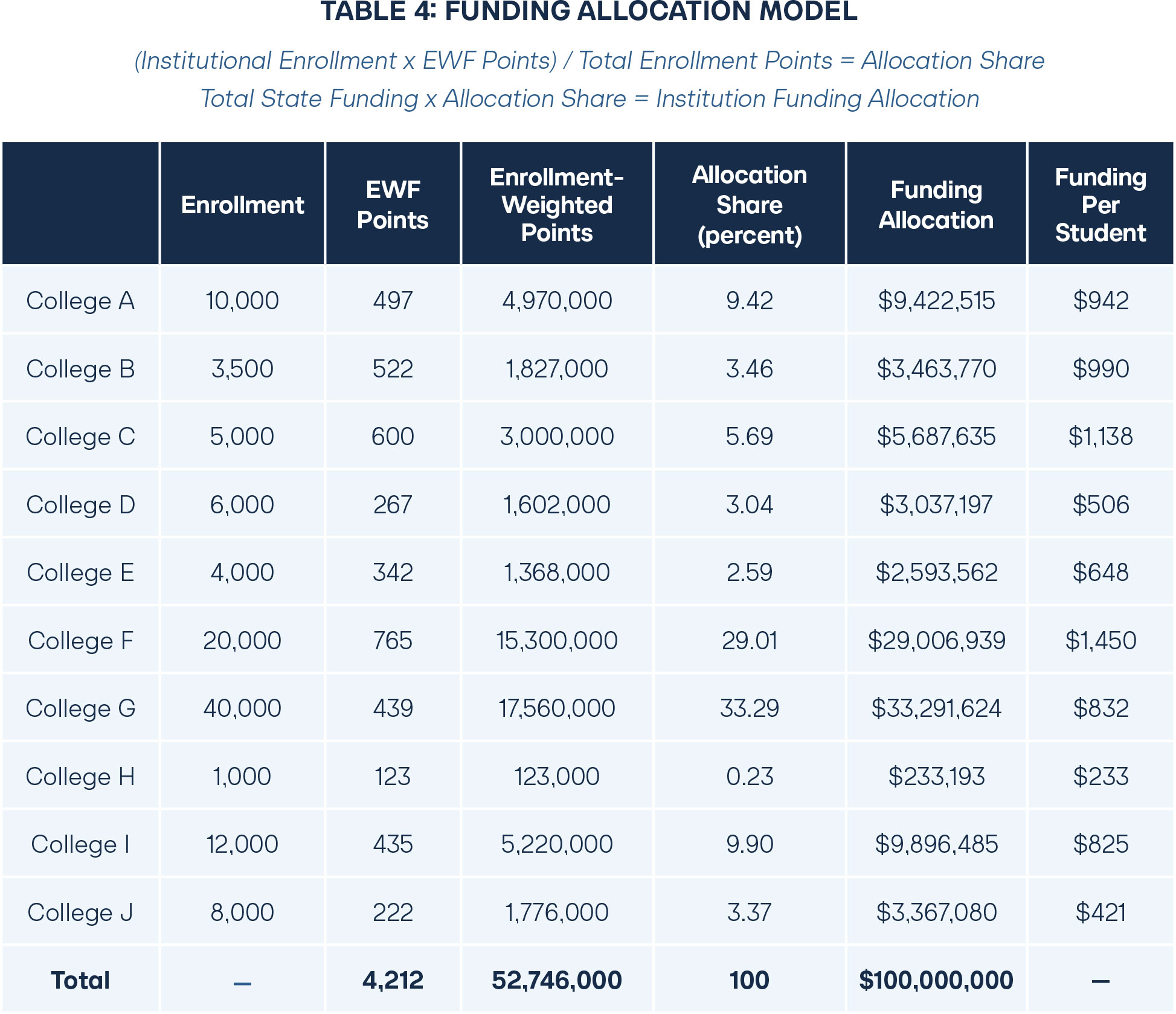 In this formulation, the total allocation to each institution is dependent on the total enrollment as well as the EWF score. However, the per student allocation is entirely dependent on the EWF score. For example, if all institutions had the same EWF score, the per student allocation would be the same for each institution (see Table 5).