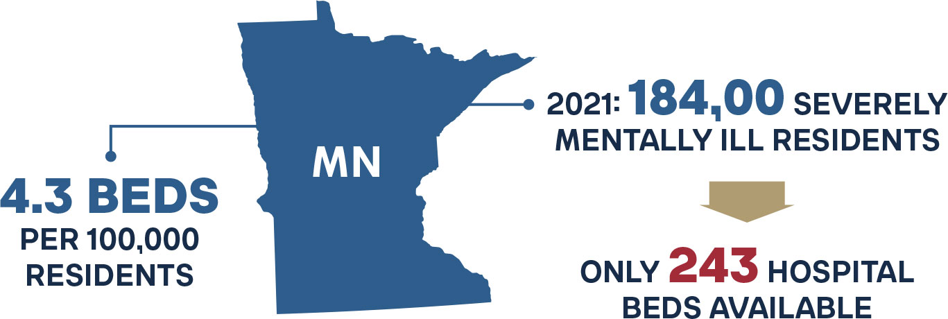 The Treatment Advocacy Center’s 2024 report shows that the optimal number of psychiatric beds is between 30 and 60 per 100,000 residents.49 The Substance Abuse and Mental Health Services Administration (SAMHSA) reported 18 psychiatric beds per 100,000 in 2022, reflecting a severe shortfall in the number of beds needed to treat the severely mentally ill in American society. Some states are worse—Minnesota has only 4.3 beds per 100,000 residents. In 2021, the Treatment Advocacy Center reported 184,00 severely mentally ill Minnesota residents with only 243 hospital beds available. A further breakdown of the SAMHSA report shows that 2,352 of 9,586 programs nationwide focus on specific client groups, particularly those involved with the criminal justice system.