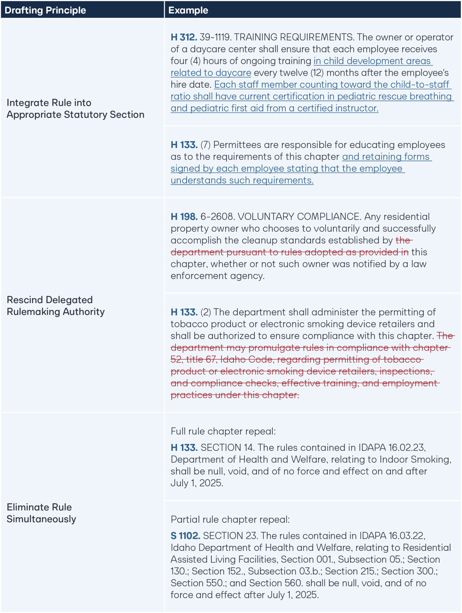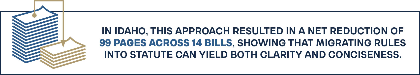 Statutory migration is most effective for longstanding, stable policies such as licensing standards, recurring program requirements, or enforcement protocols. In Idaho, this approach resulted in a net reduction of 99 pages across 14 bills, showing that migrating rules into statute can yield both clarity and conciseness. Lawmakers also valued the agency’s technical assistance in drafting bill language, which fostered a collaborative dynamic built on trust and mutual understanding.