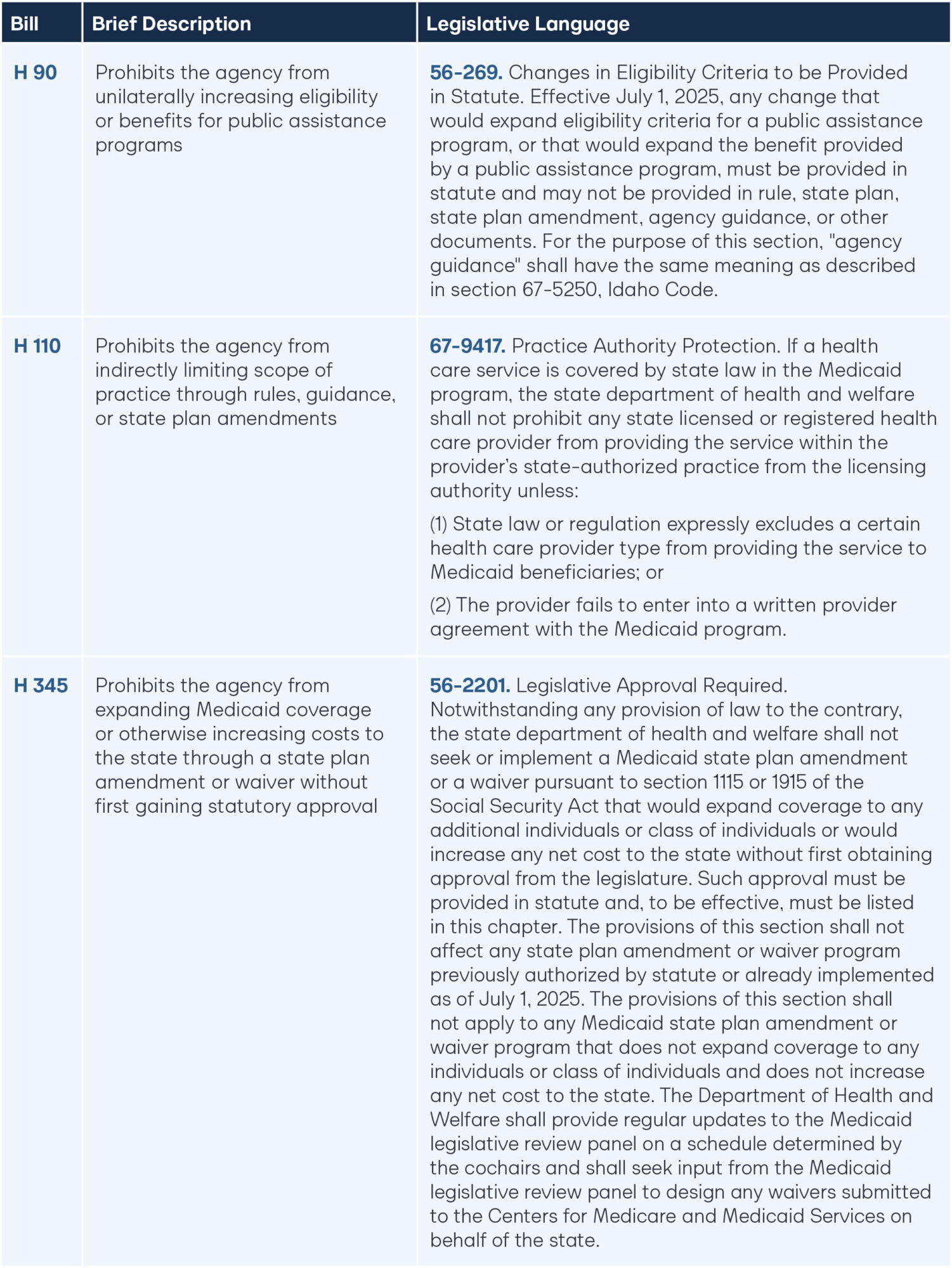 In some cases, it may also be prudent to codify explicit prohibitions on non-statutory policymaking in sensitive areas. Doing so prevents state agencies from expanding eligibility, expanding benefits, or limiting the scope of practice through guidance or state plan amendments rather than through statute. Table 3 highlights examples from the 2025 Idaho Legislative session that demonstrate how such prohibitions can be structured.