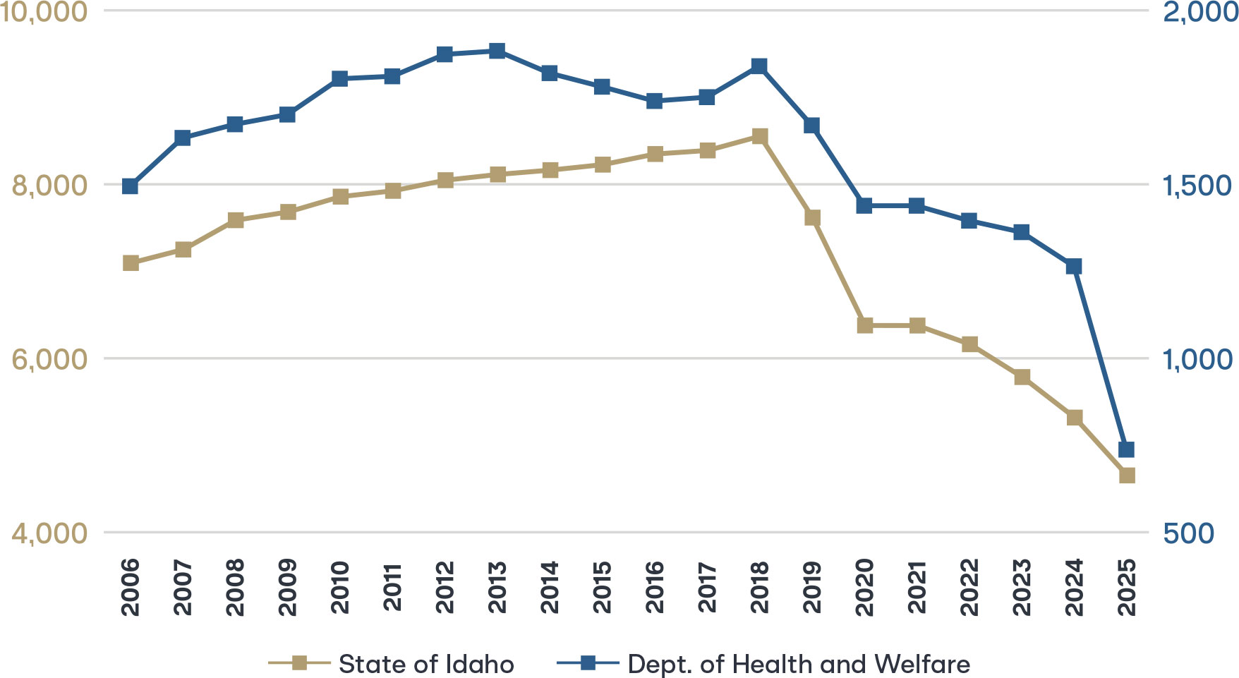 The administrative reforms described above are not merely theoretical—they have been implemented at scale in Idaho, yielding clear and measurable outcomes. Since zero-based regulation (ZBR) was enacted in January 2020, Idaho has significantly reduced its regulatory burden, improved transparency, and reinforced public trust. The regulatory code shrank significantly. Thousands of pages of administrative rules were cut, and agencies eliminated nearly 40 percent of their rules, on average, in just a few years. The combination of ZBR and rules-to-statute migration has resulted in a dramatic drop in the number of pages of administrative rules, with Idaho DHW accounting for more than 90 percent of the state’s regulatory reductions in 2025 alone (see Figure 1).