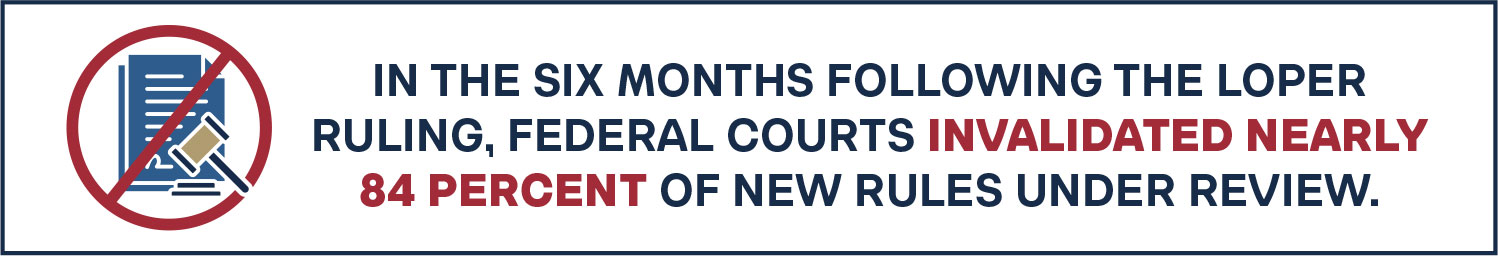 Yet this tide is beginning to turn. In Loper Bright Enterprises v. Raimondo (2024), the U.S. Supreme Court decisively overturned the longstanding Chevron doctrine, ending the era in which courts routinely deferred interpretations of ambiguous statutes to agencies.4 In its place, courts now exercise independent judgment, a shift that has already produced a sharp increase in judicial scrutiny. In the six months following the Loper ruling, federal courts invalidated nearly 84 percent of new rules under review.5 This doctrinal change interacts with the Supreme Court’s strengthening of the major questions doctrine, which requires clear legislative authorization for agency action on issues of vast political and economic significance.6 These developments signal that agencies can no longer rely on expansive statutory interpretations to justify ambitious regulatory agendas.