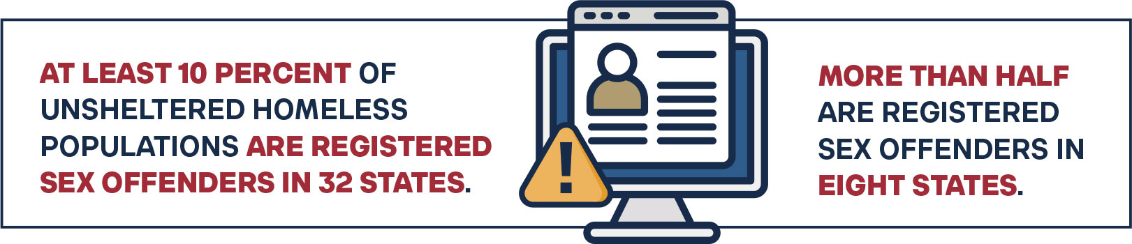 A recent study by Cicero Institute Policy Director Devon Kurtz found that at least 10 percent of unsheltered homeless populations are registered sex offenders in 32 states, and more than half are registered sex offenders in eight states.3 Harris, Levenson, and Ackerman (2014) found that between two and five percent of the nation’s registered sex offenders are homeless, significantly higher than the nationwide average of less than one percent.4 General safety concerns arise from harboring large populations of sex offenders on city streets. Many states are not compliant with the Sex Offender Registration and Notification Act, missing the legislation necessary to properly register and track unsheltered registered sex offenders.