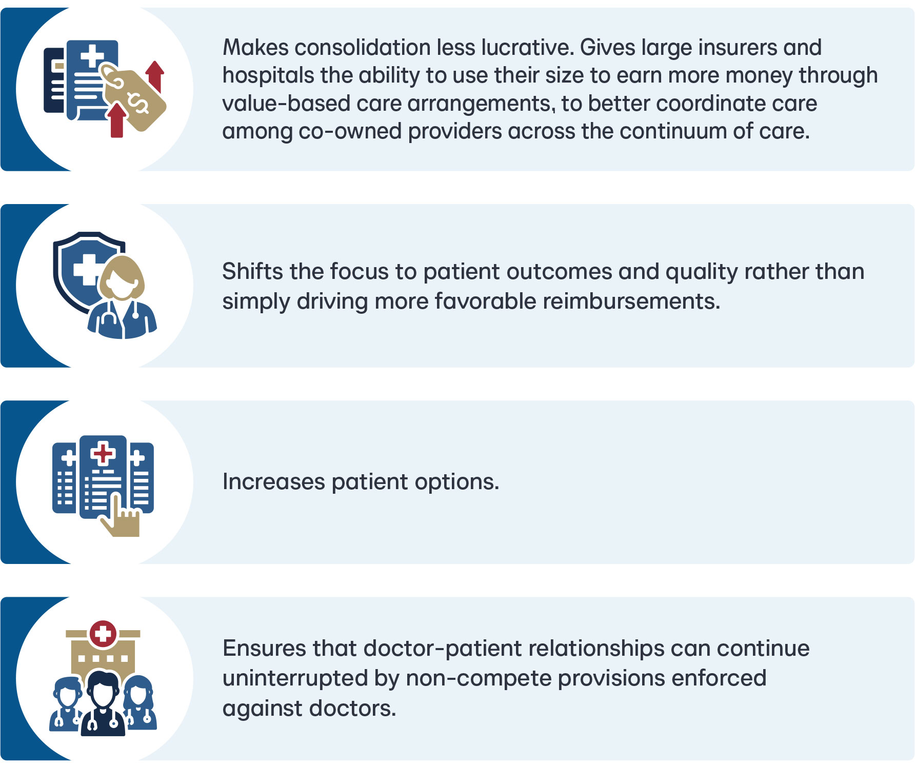 States should prohibit burdensome contract restrictions that reduce the availability of physicians and other in-demand healthcare workers. And health systems and other providers should negotiate reimbursement contracts with insurers on a level playing field that puts patients first, not their bottom lines.